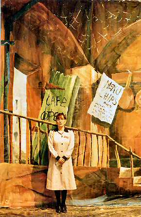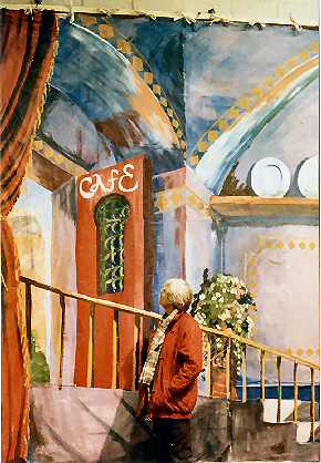 | The script called for two backcloths cloths of the same cafe interior. The first - ramshackle and run down, but the second - upmarket and smart after Mrs Baba came into a fortune. Hhere is the left hand side of the two contrasting backcloths depicting the same cafe, one dowdy and the other smart. I hope you can tell which is supposed to be which! | |