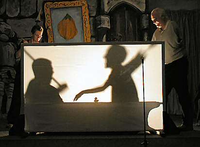 | The Ugly Sisters take a bath Photo taken during a rehearsal (non costume) This is a bed sheet stretched on a frame with a cutout bath behind (unfortunately the left hand "sister" is hiding the silhouette of the tap) The light is a 500w Tungsten halogen on a very low stand. We tried two lights but that gave a fuzzy outline. We also discovered the light had to be on the floor otherwise the audience saw the actual lamp through the screen. I like this photo, you can even see it's a toy duck on the edge of the bath. | |