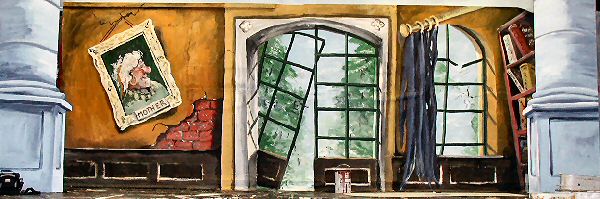 | Hardup Hall . This is 17 ft by 7 ft backcloth.