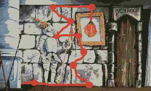 | There are two names for this effect "Woofenpoof" and the more prosaic "Rat-line". The rather tatty "painting" of a pumpkin was actually a piece of flimsy orange material held onto the blue background of the painting with a circle of Blue-tack (hence the blue paint to match the tack) Attached to the top of this material was a length of fishing line which then went through a series of eye bolts screwed into the flat in the dark sections. I rarely use black paint but broke the rules this time to ensure it was a good dark shadow. These eyebolts were also painted black. Here they are and the line highlighted in red. | |