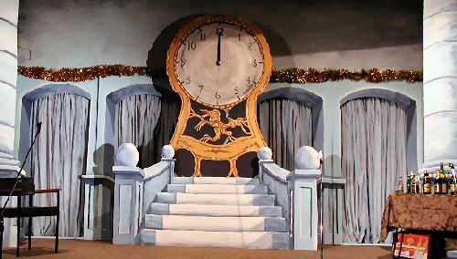 | The Ballroom Yes I know it's very big clock! The minute hand moved and was controlled by Kenny at the back. I had the head staggers (local expression) when designing this scene. I painted a perspective trompe l'oeil staircase on a single sheet of flat board, then spoilt the illusion by having the arches behind these stairs (the four running along the back wall) at a full size. I should have made them smaller to tie in with the size of the pillars at the top of the staircase. | |