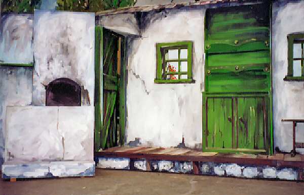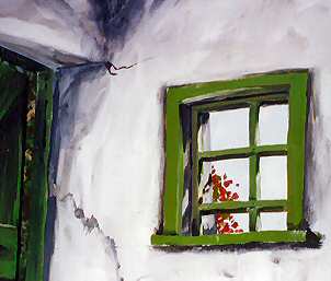 |  | The windows were painted on the flat hardboard, complete with shadows and sky. Here is a detail of one. The red plant outside was deliberate to add a spot of colour to a drab set. The whole of this was dirtied down with a dry brush of dark blues and browns ladling it on in corners where walls met. See previous page (use back button) where I had also dirtied the area above the stool on the right where people would have leant back against the wall. I enjoy making up stories like this as I work. |