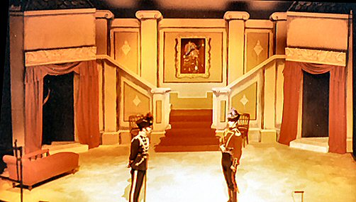 A Salon in the Pontevedrian Embassy. This theatre has a raked auditorium which causes problems with eyelines. So I painted the "tops" of the staircase balustrade and pillars in the hopes that the majority of the audience was above the eyeline. | |