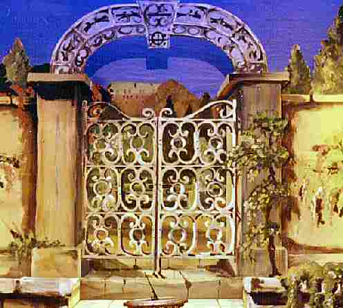 Detail of the trompe l'oeil gates. All painted on flat board. Oops too much shadow on the left pillar top and not enough on the right one. The shadow of the arch on the cyc. rather spoils the effect. I like the greens in this painting, Normally my greens are too sickly. Unfortunately I think my painting of this set was far too detailed and fussy and must have appeared to have been in competition with the costumed actors. Scenery is supposed to enhance a show not dominate it! |