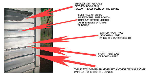 A corner of the truck carrying Laurie's Farmhouse. Base still to be painted. Photo taken in the workshop. The glazing bars are real timber but all the rest is painted on (frame, shadows, sill etc. ) Westerns appear quite often in the Amateurs' repertoire.. "Oklahoma!" "Annie Get Your Gun " etc. and inevitably there is a clapboard house in it somewhere. Below is how I paint clapboard. |