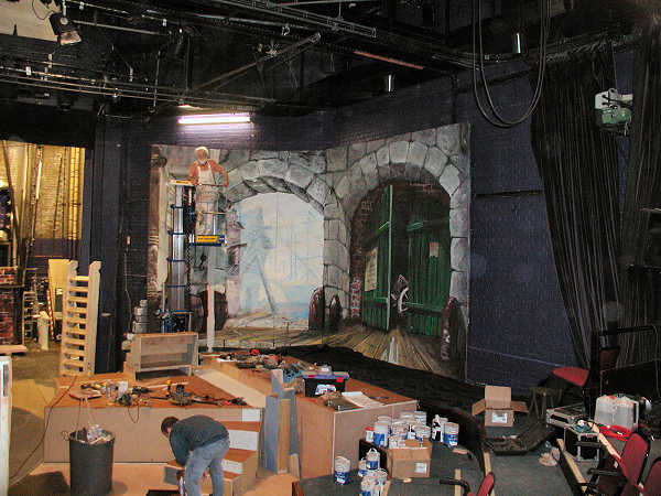 lift platform which I used when patching a join between two of my flats. Setting an eyeline/horizon line for scenery for a theatre which has a raked auditorium is a dilemma for a scenic artist. I elected to go for 6 feet off the stage floor, thus giving the best view about three rows from the front. However, this photo was taken from higher than that, hence the apparent "distortion" on the arches. | |