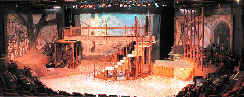 | In a way it is unfair to show this construction in this sanitised way. But this is a website for amateur (Community) scenic artists, not producers or lighting designers etc so bear with me whilst I explain that this photo was taken with all the main stage lights on to give me as much illumination for the photo as possible. But the audience never ever saw this set as you see it here. During the show there was a huge and very effective lighting plot, sections were used for little vignettes surrounded by fog. At other times a haze covered the whole acting area or smoke billowed up as a background to the Three Cripples (Yes there are different machines for smoke, haze, and fog!) Gobo, pattern lights, cast deep shadows of windows, lightning rented the sky. The extent of the revolve can be picked out by the circular cobbles. The 'get in' took a week and at one time I counted twenty people all slaving away slotting the various elements of this set together. And all volunteers who took days off to indulge in their hobby of amateur musical theatre. The revolve is about a foot off the main stage floor so a false floor also had to be built and laid to surround it and bring the whole to the same level. This photo shows 'The Bridge' in its down position. This Bridge was especially constructed for the show (By Bob Forster of Stage Services North) together with the electric hoists and rigging needed to move it up and down. It spent the bulk of the show in the grid (The theatre does not have a fly tower but there was enough room above the stage to hide it) and only came down to this position for the denouement at the end when Nancy is murdered and Bill Sikes chased and shot. An epiode complete with lots of swirling fog and blue light and eirie follow spots. But then if you've a good graphics program you can put all that texture in yourself on the above photo!!. The hired-in backcloth had not been stretched yet, those wrinkles were banished by the first performance. And the silver pipes (bottom left) had been disguised too. They were part of the fog/haze/smoke machines. | |