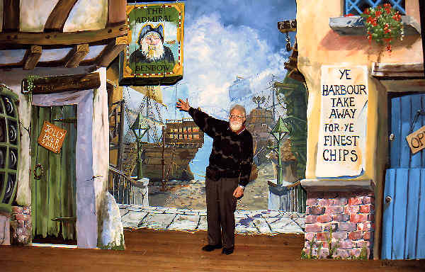 | And when it's all put together it looks like the photo below. Note how so much of the sides of the cloth is lost. But one has to take into account the view from the "Extreme Seats" (the ones in the front row at either far side) who can see around the flats into the wings. My friend Terry ("Don't forget the shadows") says there is a distinct similarity between myself and my painting of the pub sign.! | |