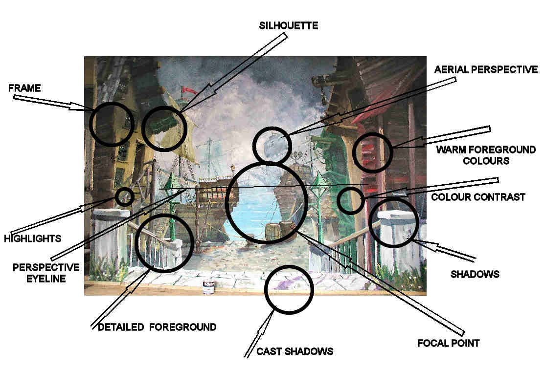 paramount in helping to give depth. In the above Dockside scene it is no accident that the eyeline