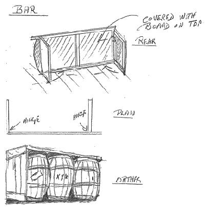 |  | And here is the practical bar. It goes Audience Left on the stage. (Position still to confirm with Producer) The sides fold in for storage. Note I can have a profile edge on the right (Barrel curve and top) as we can indent that support on the back as shown in the Plan view. but the left hand side must be straight so I will paint planking on it. No dimensions for construction yet | ||||||||||||||||||||||||||||||||||||||||||||||||||||||