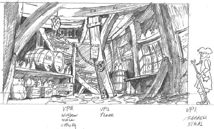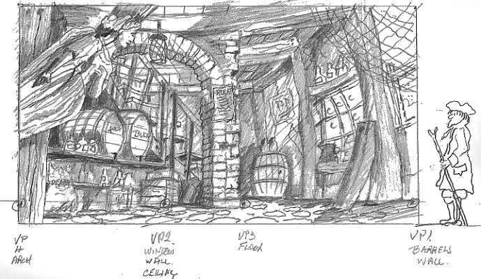 | Note figure for scale. Also the various VPs (Vanishing Points) and what they refer to. VPs are the dots surrounded by a circle on the eyeline which is a foot off the floor. (Thin pencil line) The items on the bottom left will probably be hidden by a practical bar. Although I always paint parts which are supposed to be hidden because, more often than not, (Probably in the Dress Rehearsal) it's decided to move something and that area is then exposed. Hmm. the above drawing looks a bit too much like the interior of a ship. I'll try a brick pillar instead of that wooden one. Also a wooden handrail on the stairs instead of a rope one. | |||||||||||||||||||||||||||||||||||||||||||||||||||||||