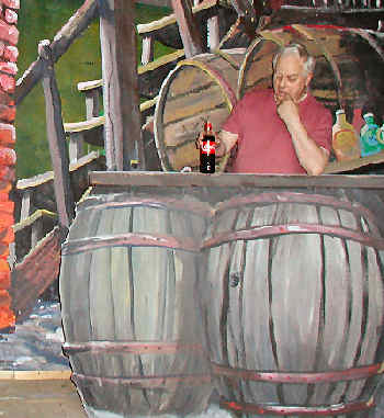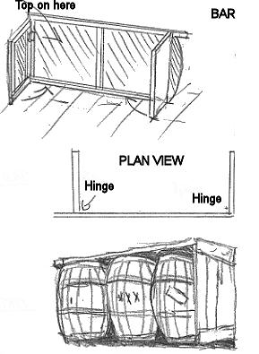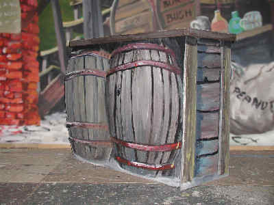 The top construction drawing of the Bar on the right is incorrect and is a mirror image of what is proposed. And below is the completed Bar. I opted for only two barrels in the end as three would have been too wide. The backcloth is not finished in this photo. |