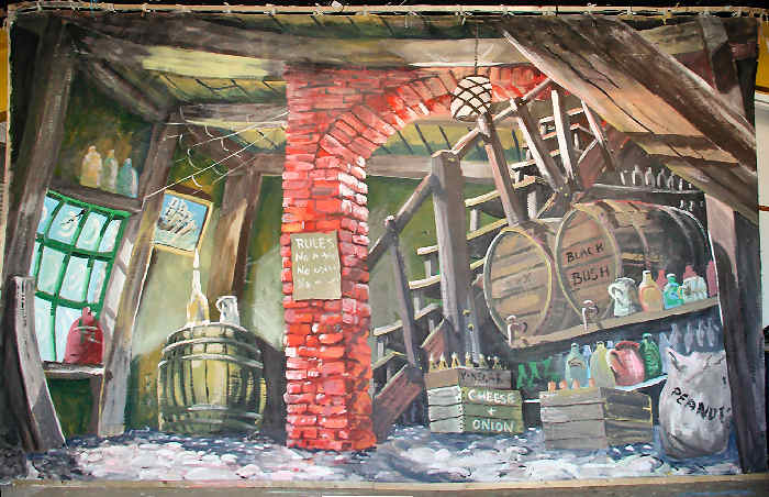 And below is the completed 17 ft. by 11 ft. cloth. I dropped the Figurehead as the cloth was getting too "busy". However I added a candle as an excuse to make that corner more colourful . Even though I knew the practical Bar will cover the bottom right hand corner, nevertheless I still painted in some detail as I have often been caught by the Producer of a show changing their mind about the position of a piece. Ooops, forgot to put some cracks in the plaster walls. |