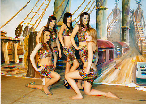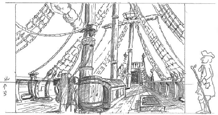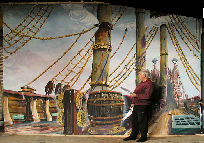 NOTES ON THE ABOVE PAINTING Cloth is 16.5 feet wide and 11.5 feet high. We are using this backcloth for two separate scenes... "Going on Board" and "On Board" which has left me with a dilemma re what to do about the sails. I have decided we will have the sails furled even when at sea, because the sails further up the mast (which you can't see) are all in use and opened out when sailing!! Ideally, if we were only using this cloth for one scene, I would have allowed myself some dramatic clouds but they would have been too obvious when used twice. However I have put in some mauve clouds bottom left to add some colour. Shadows help the impression of depth - especially on the masts. Overlaps help the impression of depth. Every element in this scene overlaps another. Contrast help the sense of depth - the white edge of the furthest mast standing in front of the poop deck. I have had to be reasonably accurate with the ropes as the "Tall Ships" visited Belfast a couple of months ago and literally half the population of Northern Ireland visited them so there's a lot of knowledgeable people out there! This cloth took longer to paint that anticipated... about 25 hours in total. Including many hours painting the ropes. Note the hoops on the foreground barrel are in perspective. |
