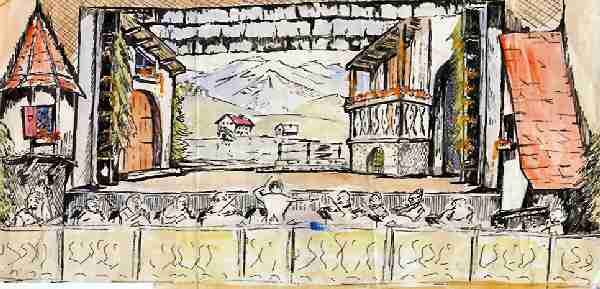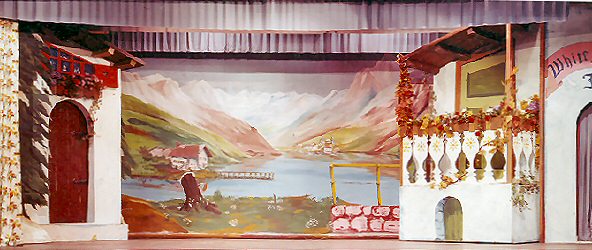 "Outside the Inn". Both left and right pieces are on castors and for the scene change to the "Cow Barn" swung inwards to make the barn, (See previous page) I hated this backcloth ( Where are the reflections?) and determined to paint better mountains - which I think I succeeded in doing many years later for "The Sound of Music" By the way this backcloth was fairly old so I ruined it even more by scraping several holes in and around the "village" in the background and hung a lamp behind the cloth so that at 'nightfall' the light twinkled through the holes to make it look like lights in the village. |